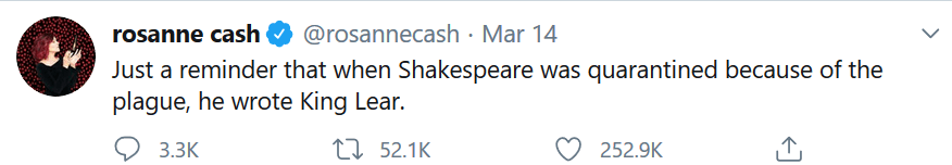 This Tweet opened up numerous debates within the arts community: for some, it was point of inspiration; for others, it was a source of unnecessary pressure. For others still, it was a reminder of the intersection between productivity and privilege- specifically in times of crisis.